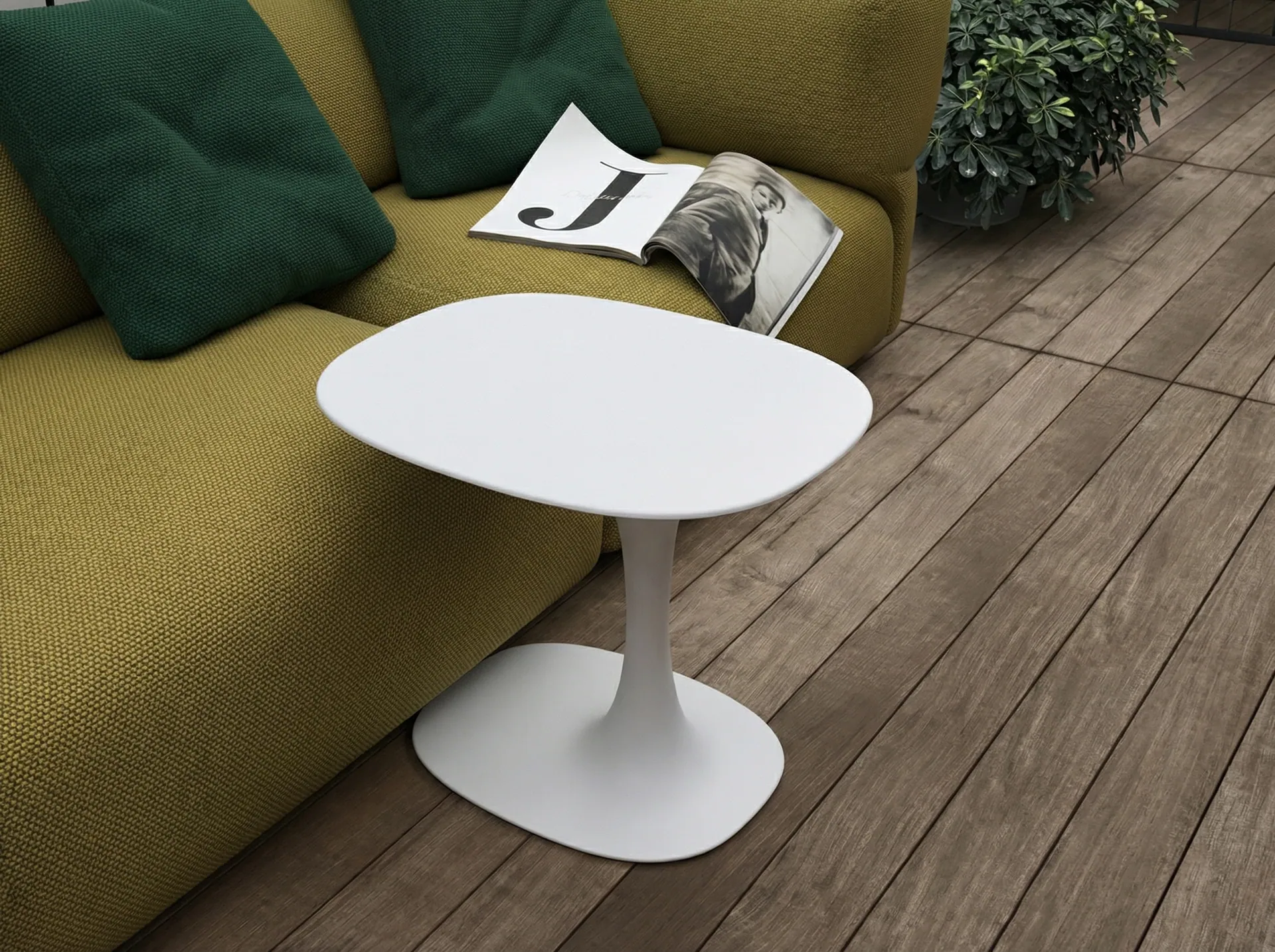 Der Awa Beistelltisch von dem berühmten japanischen Designer Naoto Fukasawa ist wunderbar minimalisitsch und kann durch sein zurückgenommenes Design auch mit anderen Materialien wie Teak und Stoff kombiniert werden. Der Tisch ist aus dem Material Chrsitalplant Outdoor, einem natürlichen Mineralstoff aus Aluminiumhydrar mit Polyesteracrylharz.