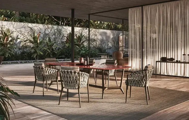 Sessel, Sofa und Stuhl, auch in stapelbarer Ausführung, sind aus einer technologisch anspruchsvollen Kombination aus fließgepresstem und druckgegossenem Aluminium hergestellt. Dank ihrer Leichtigkeit und ihres besonderen Designs sind sie sowohl für öffentliche Bereiche als auch Wohneinrichtungen perfekt, da sie zum einen ergonomischen Kriterien entsprechen und sich zum anderen in jedes Ambiente einfügen. Die Sitz- und Rückenkissen garantieren höchsten Komfort. Das lackierte Gestell ist in drei Ausführungen erhältlich und mit einem Flechtwerk versehen, das aus Kunstfaser mit hochresistenter Seele für die Outdoor-Nutzung besteht: Gestell aus Aluminium weiß lackiert mit Geflecht aus Polypropylenfaser tortora, Gestell aus Aluminium tortora lackiert mit Geflecht aus Polypropylenfaser tortora, Gestell aus Aluminium anthrazit lackiert mit Geflecht aus Polypropylenfaser anthrazit.