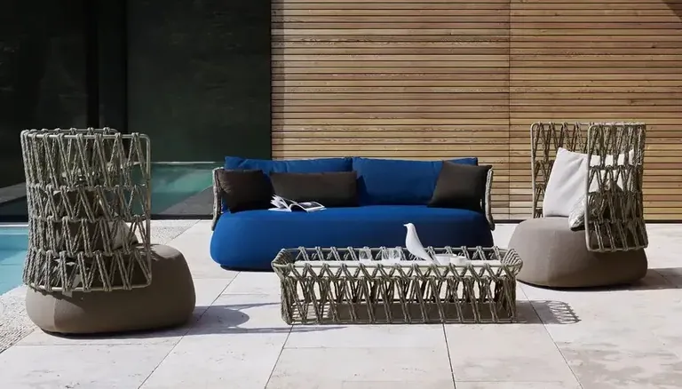 Die abgerundeten, weichen und kurvigen Formen des Sitzmöbelsystems Fat-Sofa werden auch in der neuen Outdoor-Version aufgegriffen, die sich außerdem durch ein besonderes Flechtmuster auszeichnet. Die komplett gepolsterte Sitzfläche ist mit einer Rückenlehne mit Metallgestell kombiniert, deren originelles Geflecht ein interessantes Lochmuster bildet. Das Makrogeflecht mit Graphikeffekt besteht aus gezwirnten Polyethylenfasern im Farbton taubengrau und verleiht dem Entwurf seine Einzigartigkeit. Diese basiert auf der Idee der Designerin, ihm Leichtigkeit und Transparenz zu verleihen und einen „Dialog“ mit der Umgebung herzustellen. Von Fat-Sofa Outdoor gibt es sechs verschiedene Typen: das gerade Sofa (230 cm), die großzügige Sofainsel, der Sessel mit Rückenlehne in zwei verschiedenen Höhen und eine Reihe von Hockern in unterschiedlicher Größe. Die neue Stoffkollektion umfasst auch die großzügigen Rückenkissen und setzt interessante farbliche und optische Akzente.