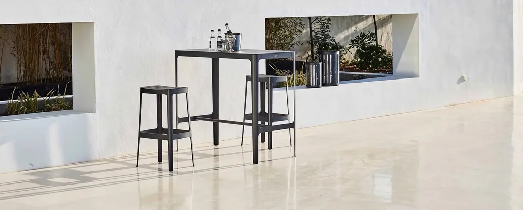 Cut ist eine sehr zurückgenommene Kollektion von Cane-line, die eine Sonnenliege, zwei Hocker und einem Outdoor Bartisch beinhaltet. Die Gestelle sind aus Aluminium gefertigt, witterungsbeständig und zeitlos.