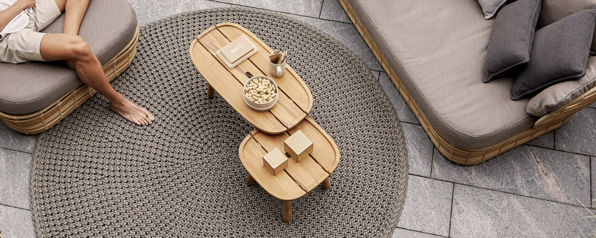 Die Cane-line Royal-Kollektion umfasst eien Gartenstuhl aus Teak und Cane-line Soft Rope in Dark Grey und zwei kleine Beistelltische, die sich mit vielen anderen Kollektionen kombinieren lassen.