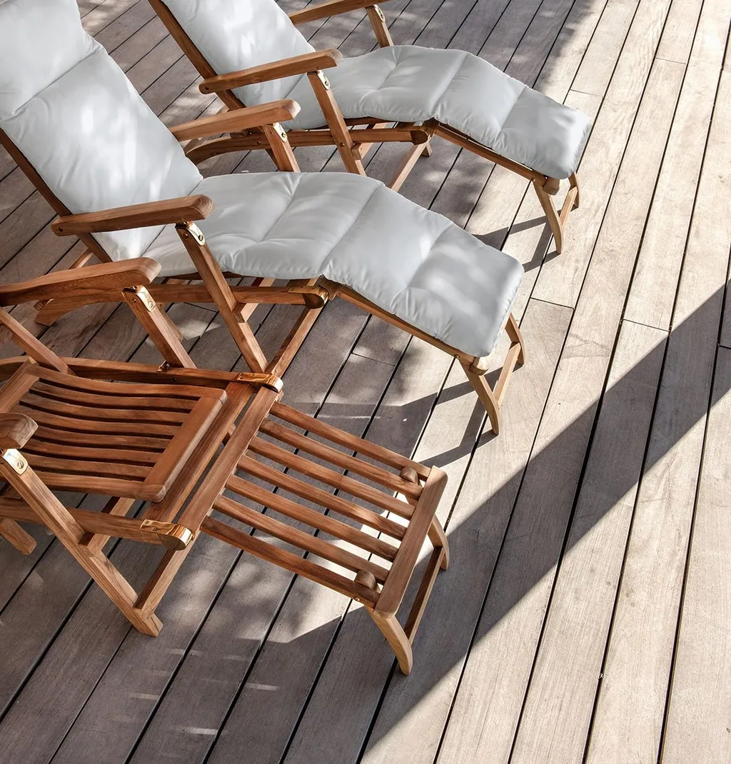 Liegestuhl mit verstellbarer Rückenlehne aus natürlichem Teakholz mit gebeizter Oberfläche oder aus lackiertem Mahagoni mit Messingdetails.
