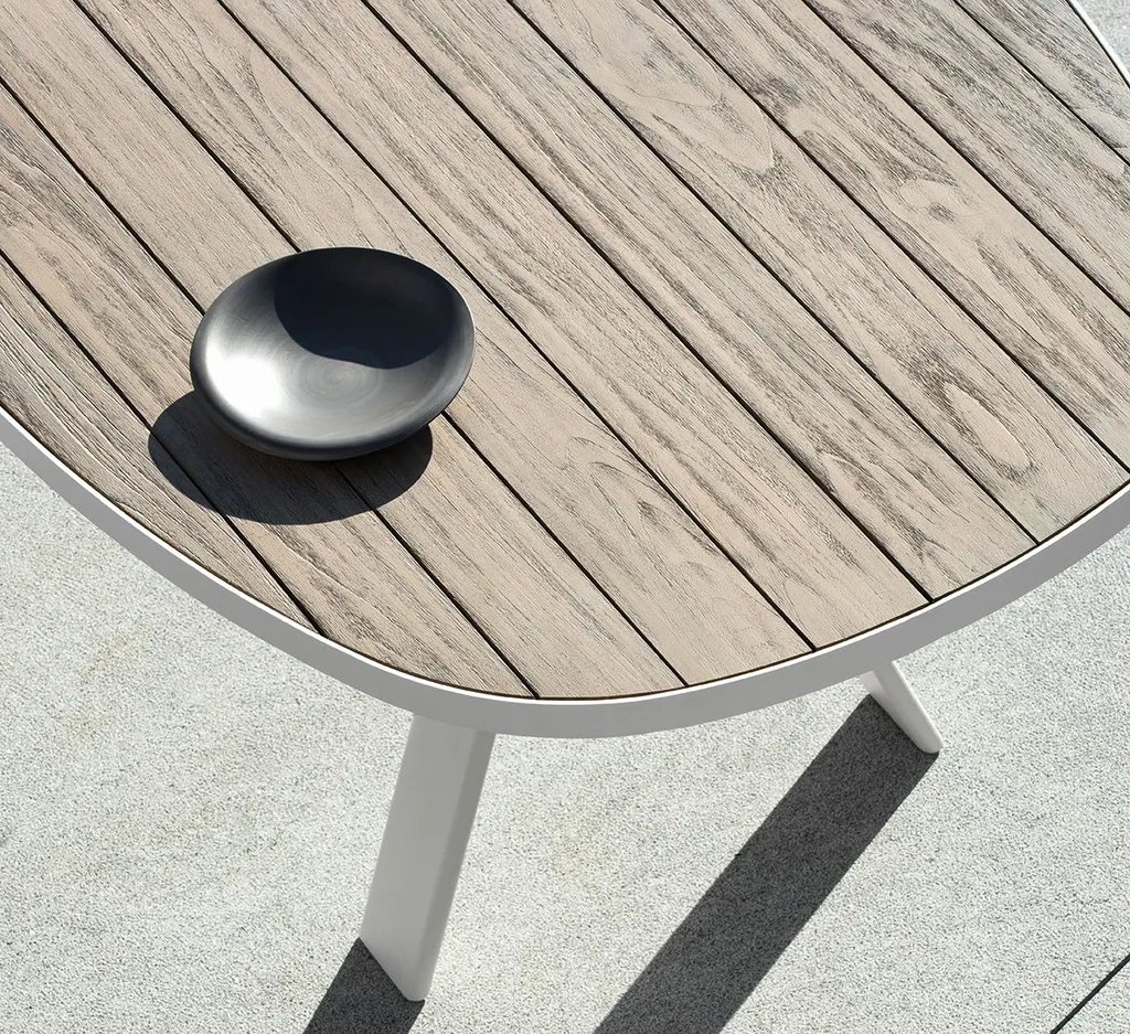 Esedra lässt sich von der antiken Kultur des Mittelmeerraums anregen, führt aber ein Konzept der Kombinierbarkeit und Zerlegbarkeit ein, das aus der beruflichen Erfahrung, zur Hälfte italienisch und zur Hälfte schwedisch, des Designers Luca Nichetto entspringt, in einem Projekt das entstanden ist, um den Bedürfnissen zeitgenössischer Umgebungenund besonders der Hotellerie gerecht zu werden. Die Kollektion umfasst bequeme Lounge-Sessel und eine komplette Auswahl an Tischen, Beistelltischen und Kaffeetischen mit Beinen aus lackiertem Aluminium und Platten aus unterschiedlichen Materialien, ideal geeignet für den Outdoor-Bereich: gebeiztes Teakholz, Keramik in Taubengrau oder Schieferschwarz