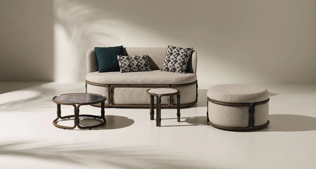 Rotin ist eine Lounge-Kollektion, die Geschichte einer modernen Art des Denkens und des Genießens, von Orten der Entspannung im Freien neu definiert. Rotin besteht aus einem Sofa, einem Loungesessel, einem Couchtisch und einem Hocker mit einem Gestell aus gebeiztem Teakholz. Sie ist von der asiatischen Tradition inspiriert, in der Bambus als das Hauptelement für die Einrichtung von Außenbereichen dient, zusammen mit Techniken, die normalerweise für die Herstellung von Rattanmöbeln verwendet werden.