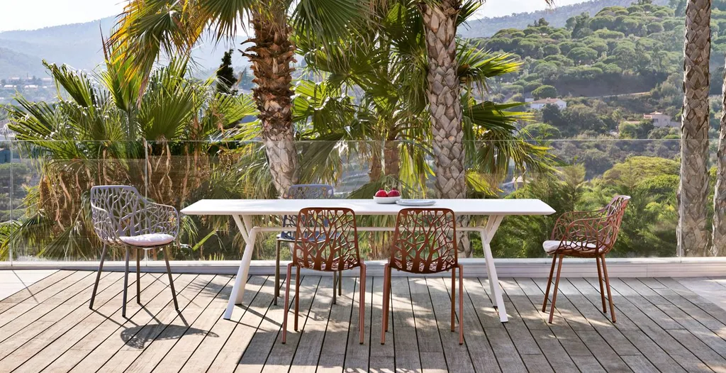 Die charakteristische Form der Tischbeine wurde von dem gleichnamigen mathematischen Zeichen inspiriert. Die leichte und geometrische Struktur aus Aluminiumdruckguss wird durch eine quadratische, rechteckige oder runde Platte in den Aluminiumvarianten und eine rechteckige Platte aus altem asiatischen Teakholz vervollständigt. Die Radice Quadra Outdoor-Tische lassen sich mit jedem Stuhl der Fast-Kollektionen kombinieren. Ein besonders raffinierter Kontrast wird durch die Kombination mit den Grafiken der Forest-Kollektion erzielt.