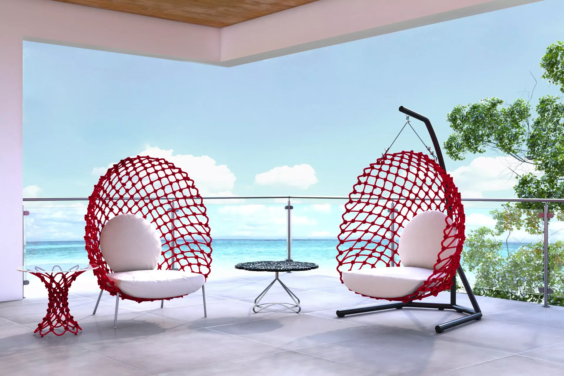 Inspiriert von Fischernetzen und aus Stoff, der um ein Stahlgestell gewickelt und gewickelt ist, umgibt Sie der Dragnet Lounge Chair wie ein Kokon.