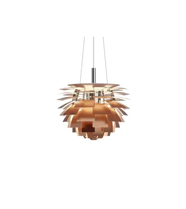Die PH ARTICHOKE Deckenlampe von Louis Poulsen besticht durch 72 metallene Blätter, die in zwölf präzise angeordneten Reihen mit je sechs Blättern für eine makellose und blendfreie Lichtabstrahlung sorgen, unabhängig vom Betrachtungswinkel. Der Name der Leuchte bezieht sich auf ihr charakteristisches Design, das das Licht sowohl nach innen als auch nach außen auf angenehme Weise strahlen lässt.