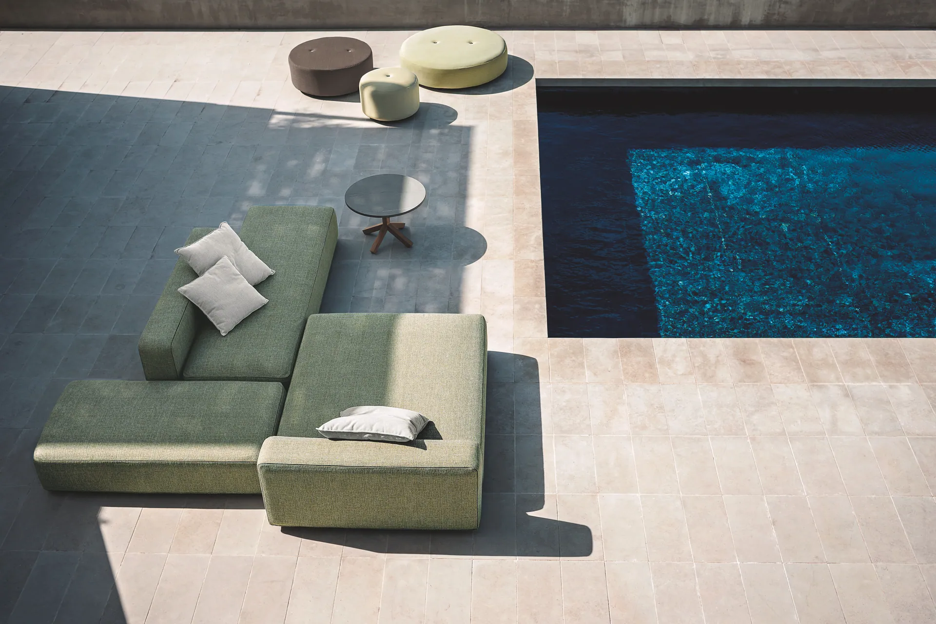 Die Polsterkollektionen erweitern das Konzept der Atmungsaktivität der wasserdurchlässigen Kissen zu höchsten Höhen und bester Effizienz. Für die Polsterkollektionen Dandy und Double kombiniert RODA offenzelliges Polyurethan unterschiedlicher Dichte und ermöglicht so die Dränage des Wassers und einen perfekten Sitzkomfort. Das 3D-Netz um das Dränage-Polster verleiht dem Produkt einen angenehmen, kompletten Look, auch ohne Polsterbezug. Die Strukturen, auf die die Polster gepasst werden, bestehen aus mit Pulverlack beschichtetem Aluminium und garantieren Leichtigkeit, Robustheit und absolute Witterungsfestigkeit. Die Roda Dandy Loungegruppe verwandelt jeden Raum sehr raffiniert zu einem fortschrittlichen und komfortablen Sitzbereich.