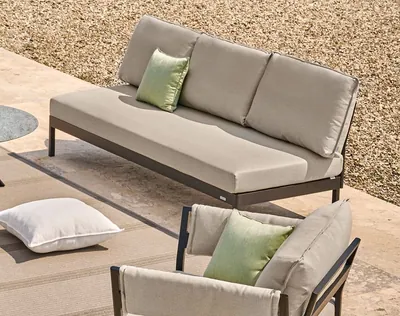 Das handwerklich gearbeitete Teakgestell wird durch pulverbeschichtete Metallwangen in Weiß oder Anthrazit ergänzt. Die Polsterbezüge aus unserem bewährten Dolan® (100% Polyacrylgewebe) bzw. neuem Polsterstoff „New Hampton “ sind in einer breiten Farbpalette erhältlich. Für eine individuelle Gestaltung stehen neben einem klassischen 3-Sitzer Sofa und einem Einzelsessel verschiedene Elemente zur Wahl.