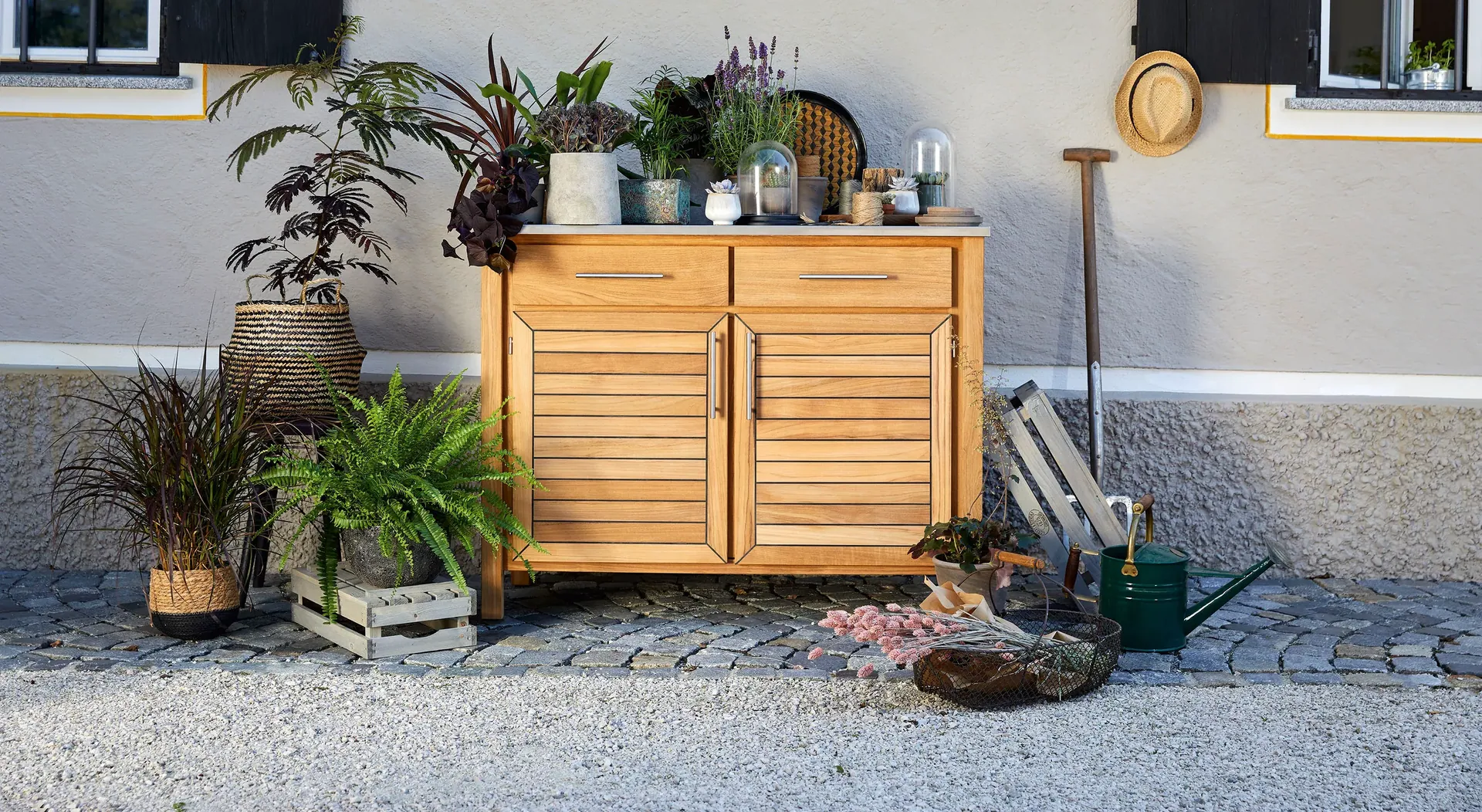 Für die Nebenrolle an der Wand sind sie eigentlich viel zu schade. Die neuen Outdoor-Schränke stehen gerne im Mittelpunkt. Schließlich sind sie nicht nur zuverlässige Assistenten, wenn es ums Verstauen geht, sondern neben aller gebotenen Funktionalität auch Schmuckstücke, die an jedem Ort die Blicke auf sich ziehen. Alle Modelle werden aus massivem, unbehandeltem Teak bzw. Teakdeck (Teak mit Silikat verfugt) gefertigt.